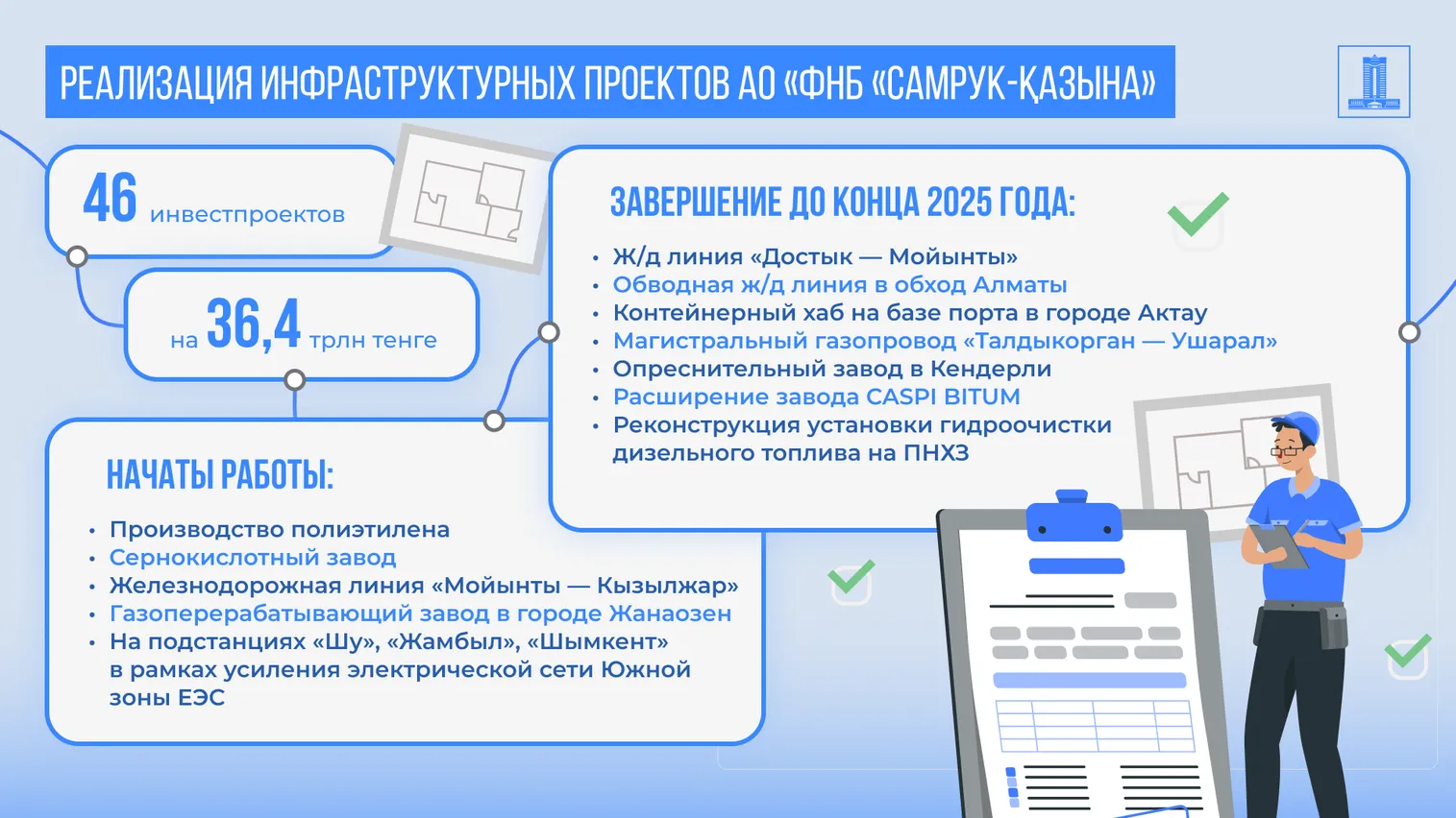 По словам Нурлана Жакупова, до конца 2025 года планируется завершение таких инфраструктурных объектов, как железнодорожная линия «Достык – Мойынты», обводная железнодорожная линия в обход Алматы, контейнерный хаб на базе порта в Актау, магистральный газопровод «Талдыкорган – Ушарал», опреснительный завод в Кендерли, а также проектов по расширению завода CASPI BITUM и реконструкции установки гидроочистки дизельного топлива на Павлодарском нефтехимическом заводе.