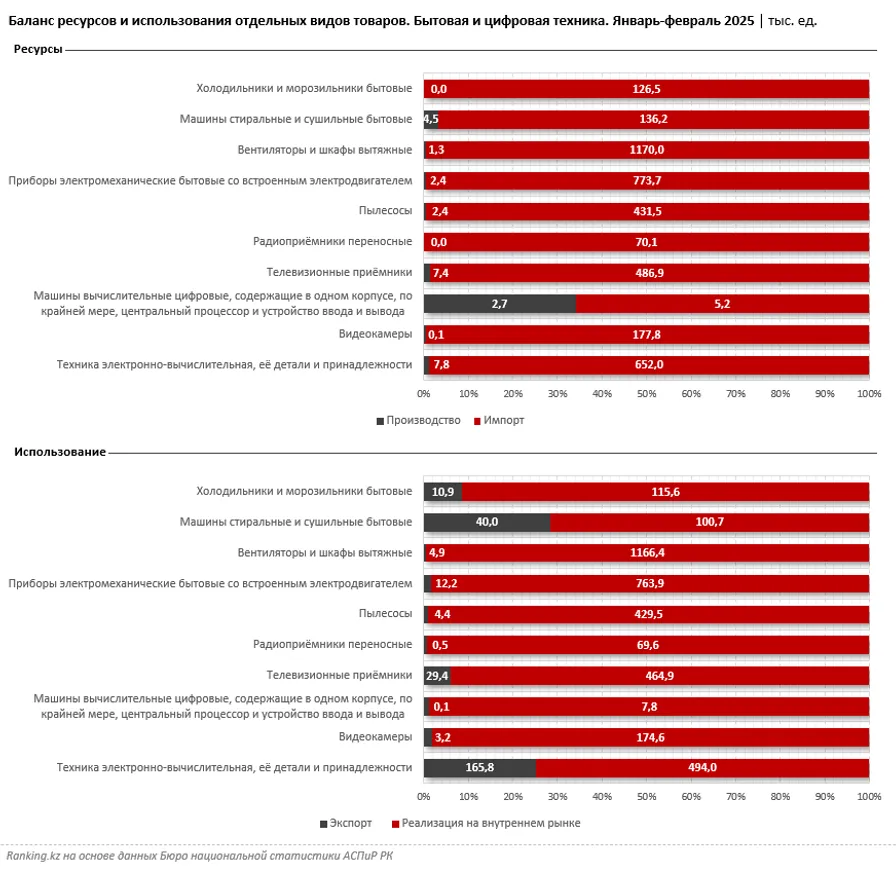 Согласно данным БНС, в девяти из десяти категорий доля импорта в общем объеме ресурсов в январе-феврале 2025 года превышала 96%. Исключением стал только раздел электронно-вычислительной техники. Собственное производство компьютеров занимает в ресурсах 34,1%. Лишь небольшая часть произведенных и импортных компьютеров идет на экспорт, 98,8% такой продукции остается на внутреннем рынке. В начале года сообщалось о том, что в Казахстане заметно вырос объем собственного производства вычислительных машин. В прошлом году в этом секторе электронной промышленности наблюдался подъем.