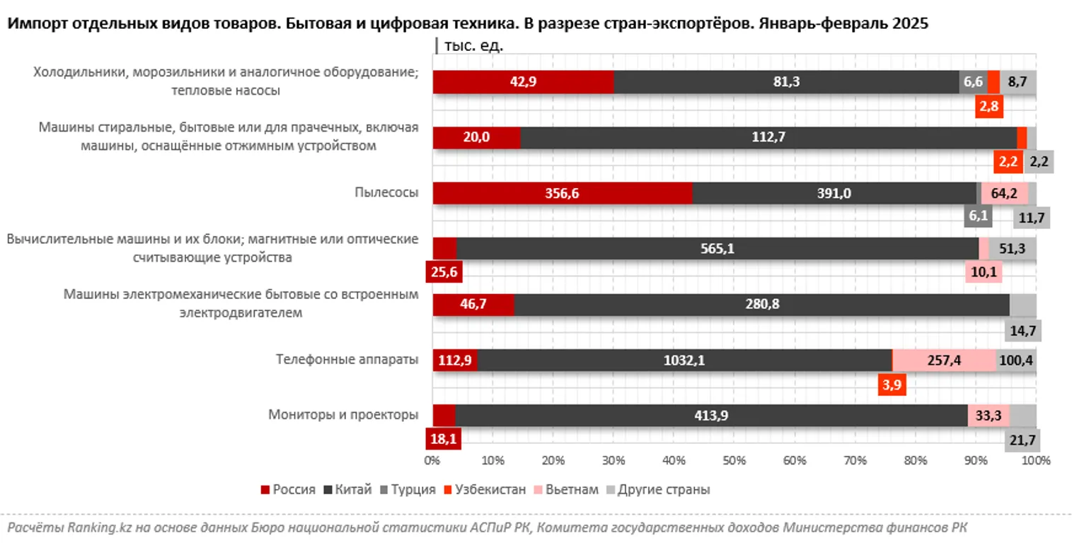 Россия лидирует среди импортеров из Казахстана по таким категориям товаров, как вычислительная техника (доля — 88,2%), электромеханические бытовые приборы (73,5%), мониторы и проекторы (64,7%).