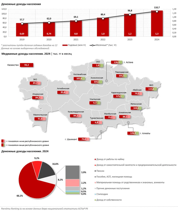 Денежные доходы — это не только зарплата, хотя она и занимает наибольшую долю (66,1%), но и все другие финансовые поступления. В структуре общих денежных доходов казахстанцев 16,6% занимают пенсии, 9,2% — доходы от самозанятости или предпринимательской деятельности. На различные социальные пособия, жилищную помощь и АСП приходится всего 3,9%.