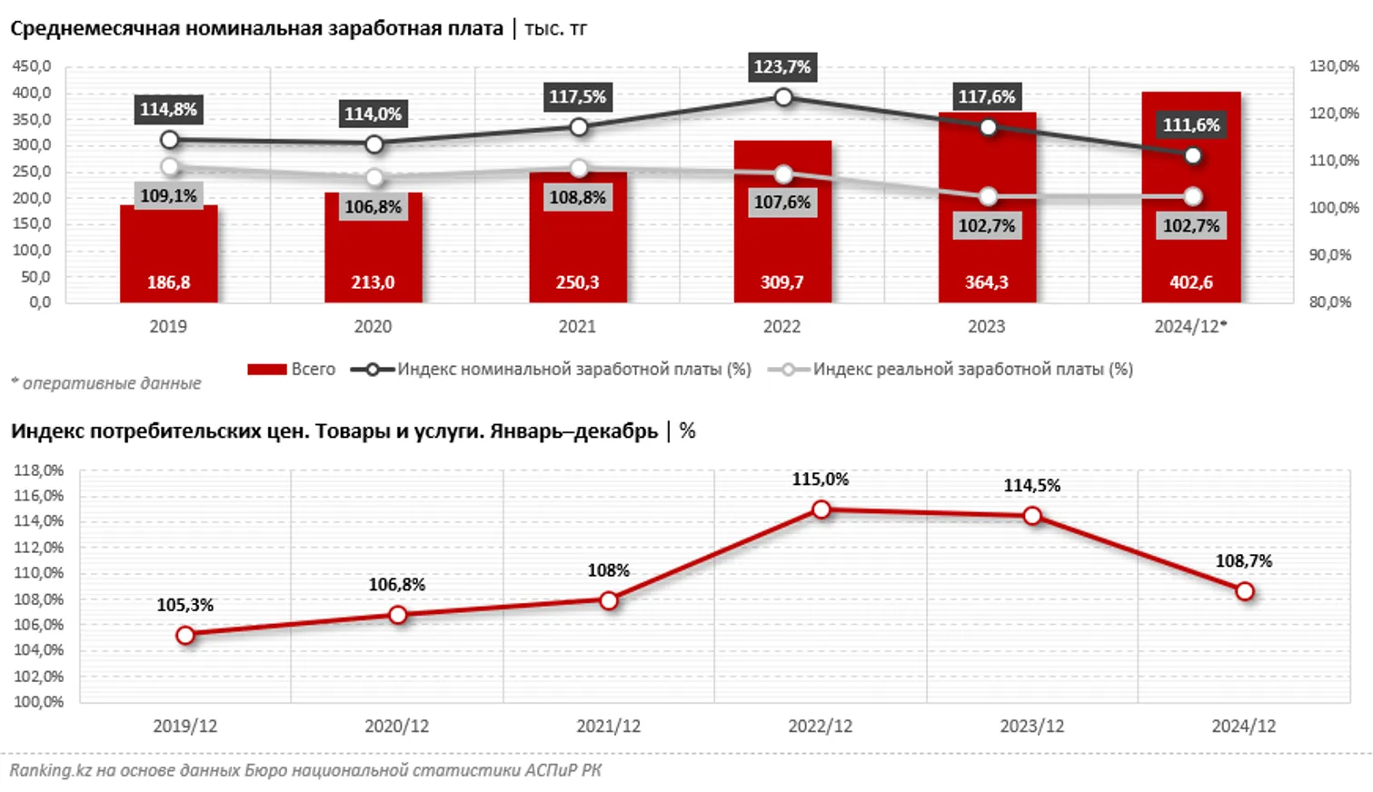 Рассмотрим, как менялась с годами главная статья доходов казахстанцев — зарплата. В абсолютном выражении средняя номинальная заработная плата за пять лет выросла в 2,2 раза, со 186,8 тыс. до 402,6 тыс. тенге. Безусловно, ежегодный рост был умеренным. Максимальное увеличение наблюдалось в 2022 году (на 23,7%), минимальное — в прошлом году (всего на 11,6%).