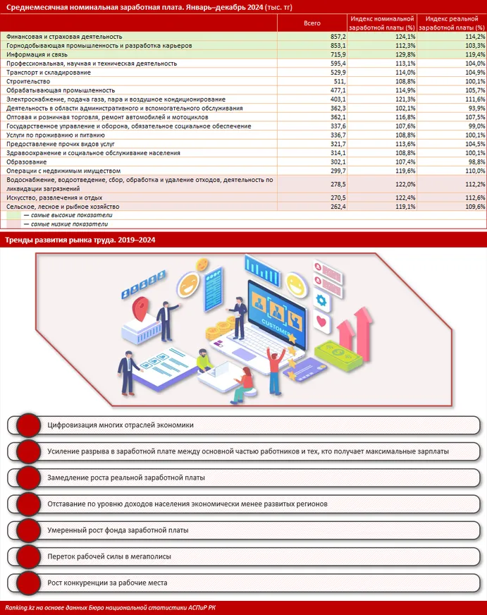 В каких отраслях экономики казахстанцы зарабатывают больше всего? В прошлом году в топ-3 самых высокооплачиваемых секторов, по данным БНС, входили финансовая и страховая деятельность (с номинальной зарплатой в 857,2 тыс. тенге), горнодобывающая промышленность (853,1 тыс. тенге), информация и связь (715,9 тыс. тг). У финансистов и «айтишников» в прошлом году был зафиксирован значительный рост номинальной зарплаты: на 24,1% и на 29,8% соответственно. Для занятых именно в этих отраслях экономики можно говорить о росте покупательной способности получаемых за труд доходов. Покупательная способность заработных плат в финансовом секторе выросла на 14,2%, в IT и телекоммуникациях — на 19,4%. За пять лет ситуация несколько изменилась: в 2019-м нефтедобыча и финсектор так же были в лидерах по зарплатам, а вот третье место тогда занимала экспертная деятельность. Однако с тех пор цифровизация и развитие IT позволили совершить скачок как в объёмах оказываемых услуг, так и в размерах зарплат, и попасть в тройку лидеров.