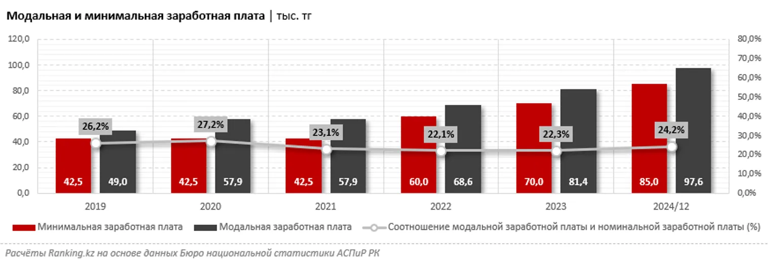 Помимо этого, есть понятие модальной заработной платы — это показатель, который встречается наиболее часто среди всех зарплат работников. Судя по данным БНС, в январе–декабре 2024 года этот показатель составлял всего 97,6 тыс. тенге, лишь на 12,6 тыс. тенге превышая минимальную заработную плату. Соотношение модальной и среднестатистической номинальной зарплаты — 24,2%. Это значит, что наиболее часто встречающаяся заработная плата составляет всего четверть от главного статистического измерителя зарплат казахстанцев, который чаще всего используется государственными органами для анализа рынка труда. Судя по статистическим отчётам, ситуация не меняется уже несколько лет.