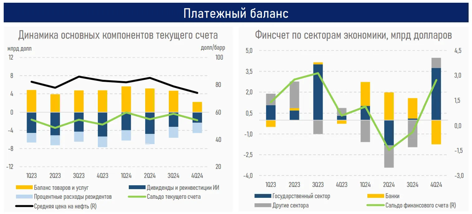 Финансирование дефицита текущего счета за счет резервных активов Нацбанка значительно снизилось (892 млн долларов в 2024 году против 5,9 млрд долларов в 2023 году) и в большей степени покрывалось притоком по финсчету (1,1 млрд долларов).
