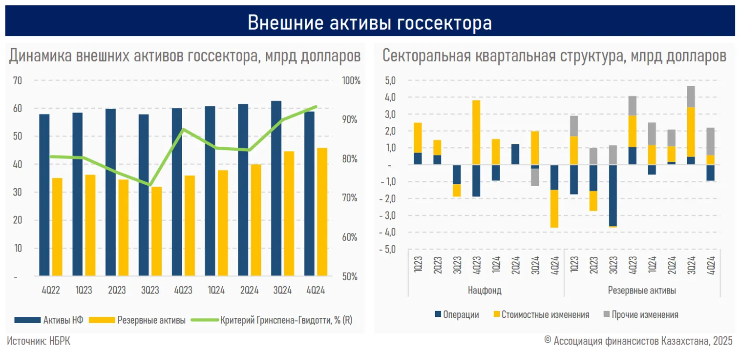 Меньшее использование резервов и рост цен на золото привели к значительному росту золотовалютных резервов НБРК (+27%), тогда как активы Нацфонда сократились (-2%) из-за высоких изъятий.