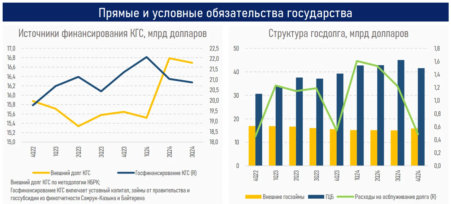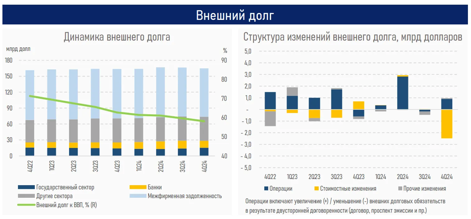 При этом Минфин РК минимизирует валютные риски, привлекая новые внешние займы (1,3 млрд долларов в 2024 году) только для рефинансирования, без особого увеличения общего объема внешнего госдолга (см. ниже).