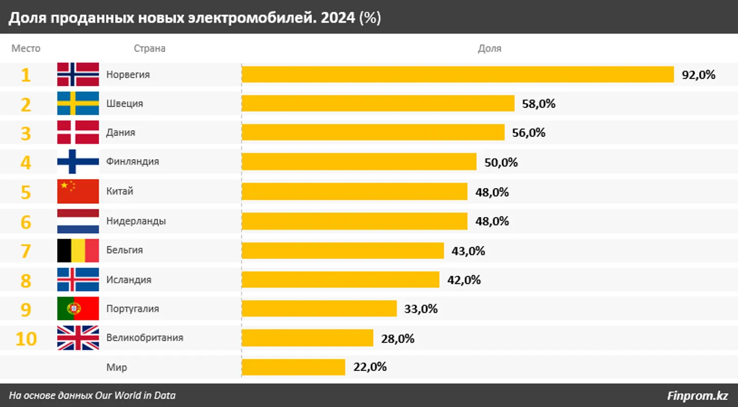 По итогам 2024 года 22% всех проданных автомобилей в мире пришлось на электромобили. Основной спрос сформировался в странах Европы. В Норвегии доля электрокаров в общем объеме продаж достигла 92%, в Швеции — 58%, в Дании — 56%. В десятку стран-лидеров также вошли Финляндия, Китай, Нидерланды, Бельгия, Исландия, Португалия и Великобритания. В настоящее время в мире насчитывается почти 60 млн электромобилей. Для сравнения: в 2022 году их было только 26 млн.