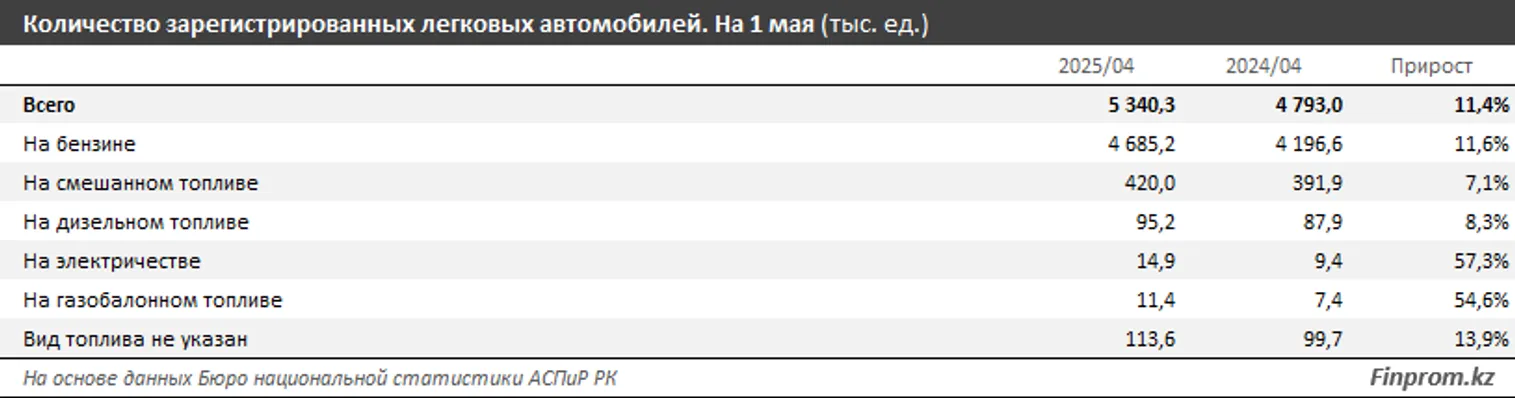 На 1 мая текущего года в РК было зарегистрировано 5,3 млн легковых автомобилей — на 11,4% больше по сравнению с аналогичным периодом 2024-го.