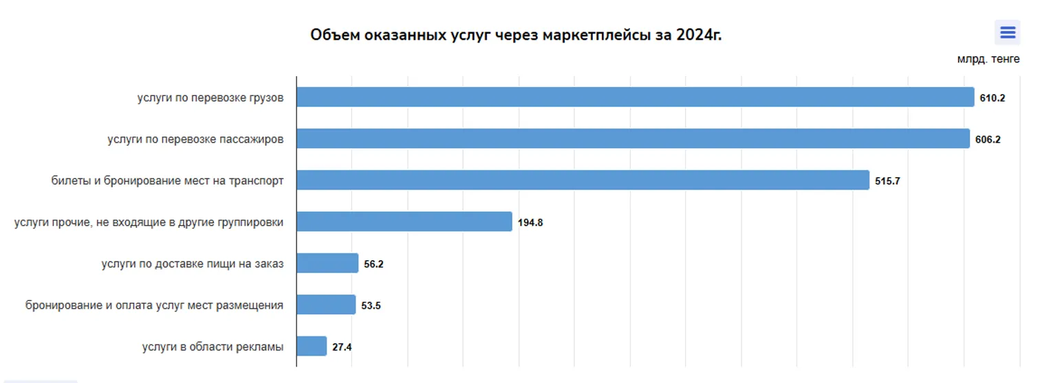 В 2024 году объем электронной коммерции услуг с учетом маркетплейсов составил 2443,4 млрд тенге. Объем оказанных услуг через платформу электронной коммерции (маркетплейс) составил 2065,2 млрд тенге (84,5%). Объем оказанных услуг через собственный интернет-ресурс - 378,2 млрд тенге (15,5%).