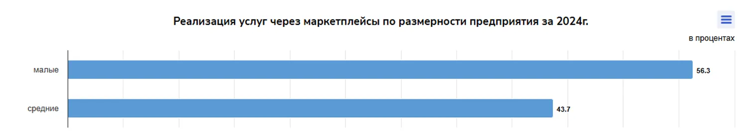 Наибольшая доля (56,3%) от общего объема оказанных услуг осуществлялась через маркетплейсы с численностью работников до 100 человек (малые предприятия) и 43,7% – средними предприятиями.