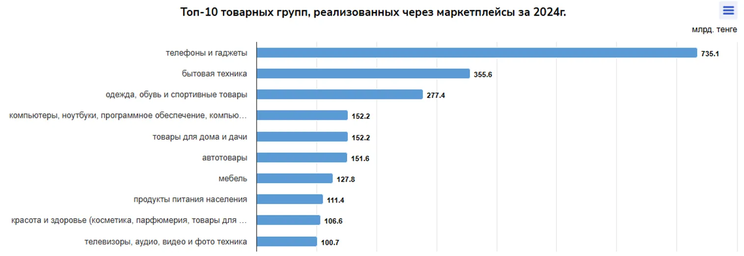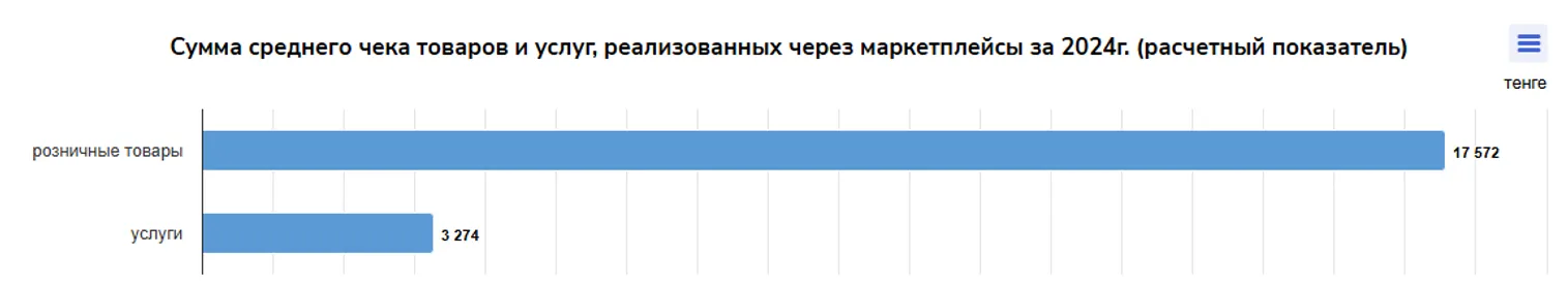 В 2024 году на маркетплейсах средний чек для розничных товаров, реализованных через маркетплейсы, составил 17 572 тенге, для оказанных услуг – 3 274 тенге.