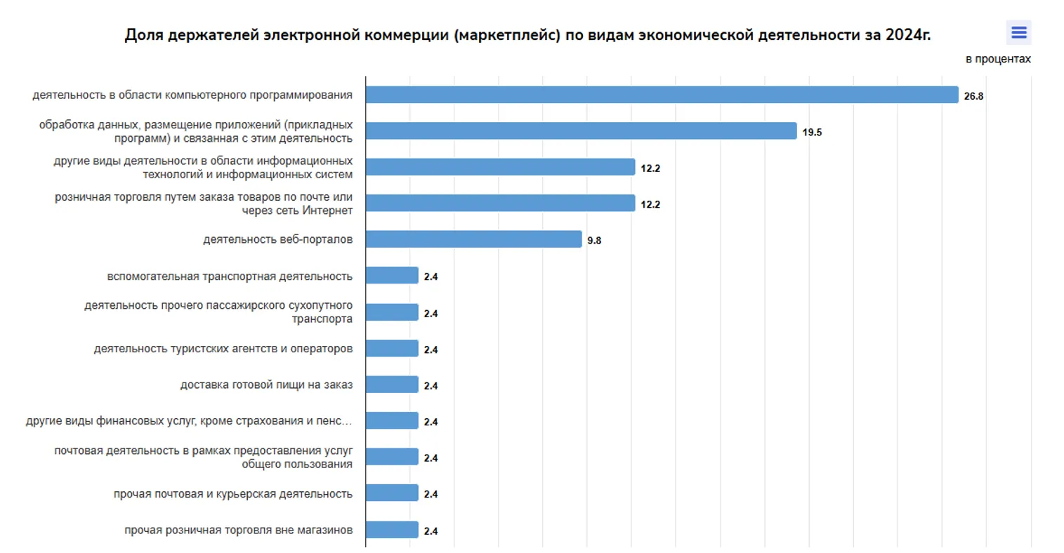 В 2024 году на рынке электронной коммерции наибольшая доля держателей платформ (маркетплейс) по видам экономической деятельности приходилась на деятельность в области компьютерного программирования – 26,8%, обработку данных, размещение приложений (прикладных программ) и связанную с этим деятельность – 19,5%, розничную торговлю путем заказа товаров по почте или через сеть интернет – 12,2%, другие виды деятельности в области информационных технологий и информационных систем – 12,2%.