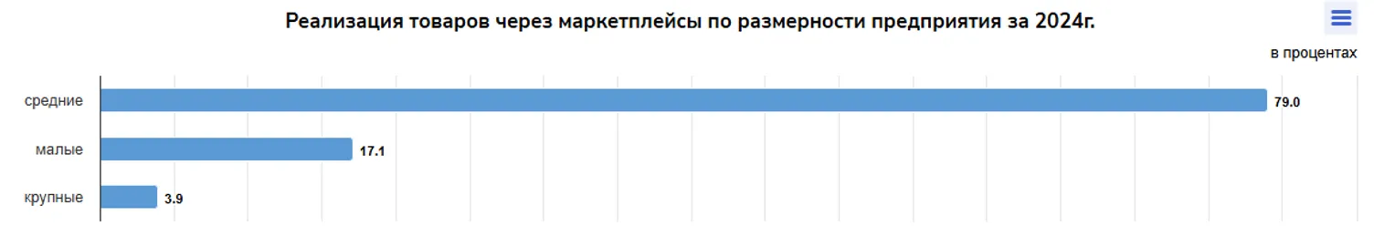 Наибольшая доля (79%) от общего объема розничной электронной торговли через маркетплейсы приходится на средние предприятия, малые – 17,1% и крупные – 3,9%.
