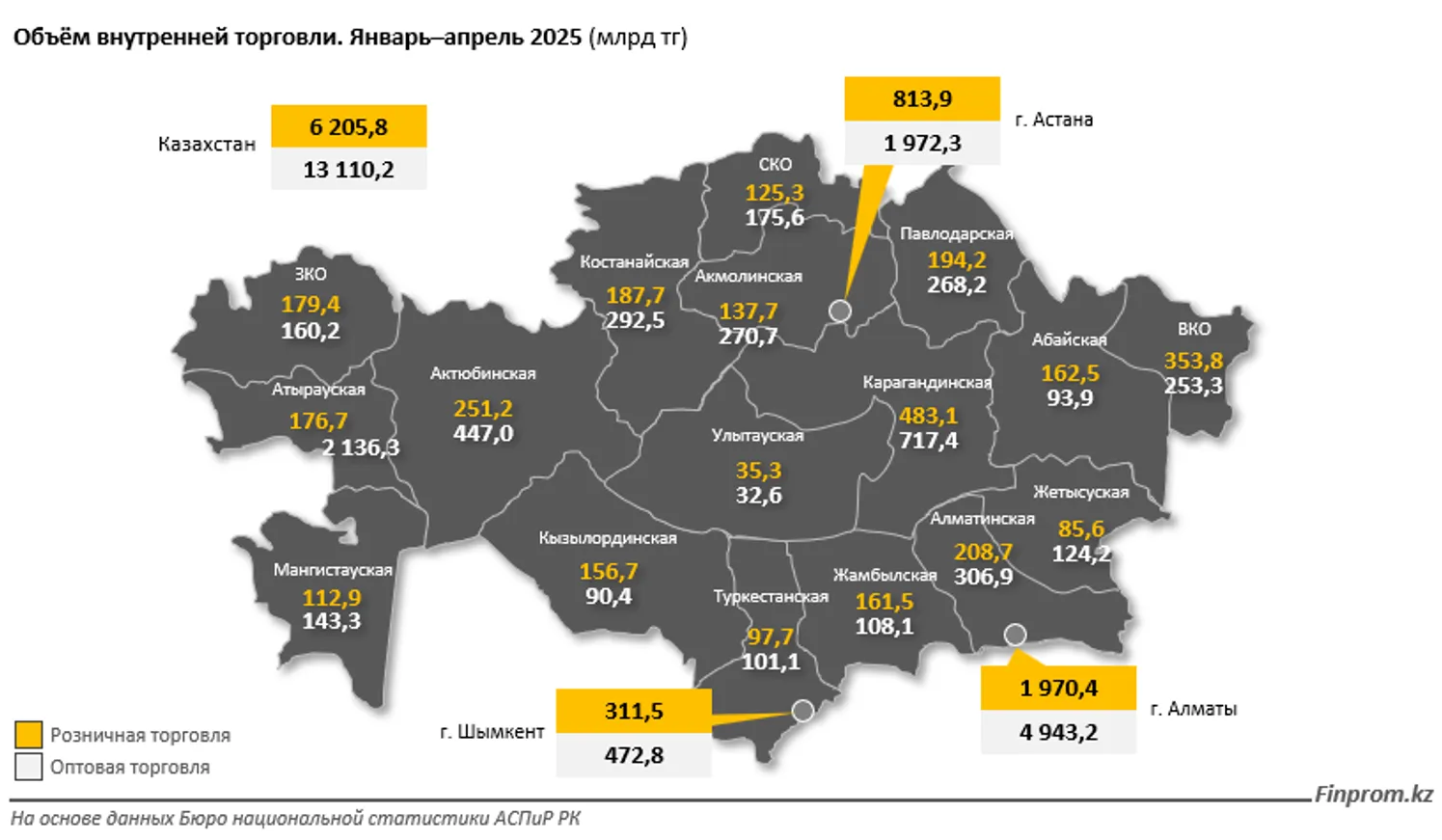Параллельно с сокращением количества рынков уменьшилось и число торговых мест в таких точках реализации: на 5,9%, до 150,9 тыс. В региональном разрезе больше всего торговых мест на 1 января 2025 года насчитывалось на рынках в Алматы: 26,2 тыс. — на 11,8% больше, чем годом ранее. В тройку лидирующих по этому показателю регионов также вошли Жамбылская (19,8 тыс.) и Алматинская (17,5 тыс.) области.