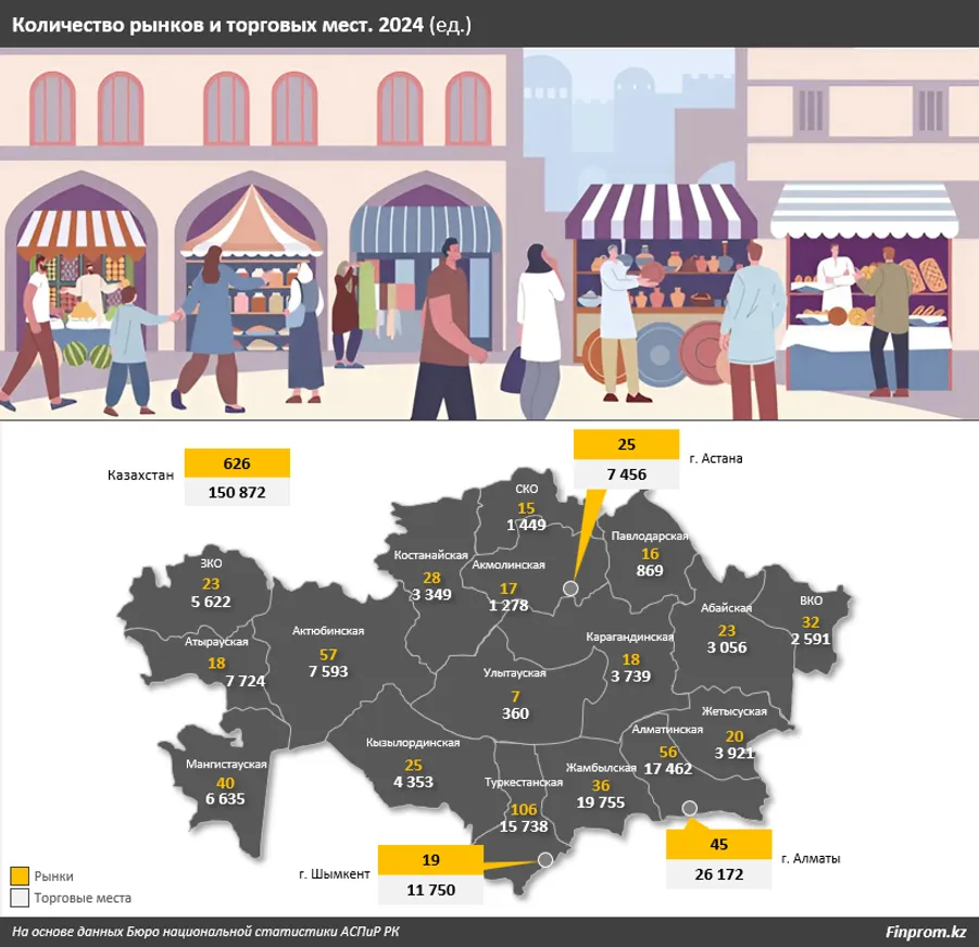 На 1 января 2025 года в Казахстане насчитывалось 626 торговых рынков — на 2,8% меньше, чем годом ранее. Больше всего рынков было расположено в Туркестанской (106), Актюбинской (57) и Алматинской (56) областях. Преобладающее большинство — 433 рынка — находятся в городской местности, против 193 в селах, сообщает Finprom.kz.