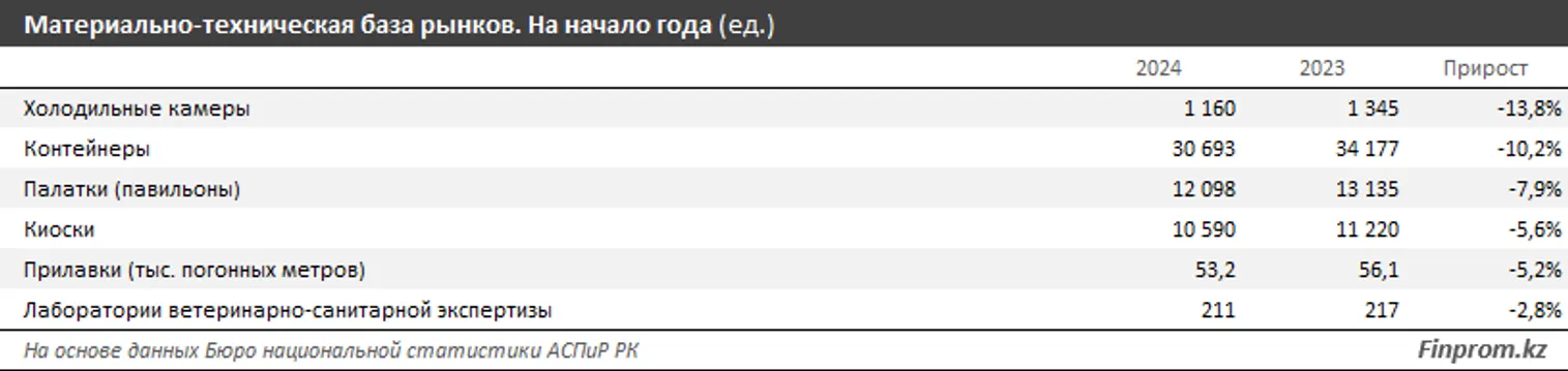 В то же время на начало 2024 года наблюдалось ухудшение материально-технической базы торговых рынков. Количество холодильных камер сократилось на 13,8%, до 1,2 тыс. Контейнеров стало меньше на 10,2%, до 30,7 тыс., палаток и павильонов — на 7,9%, до 12,1 тыс., киосков — на 5,6%, до 10,6 тыс., лабораторий ветеринарно-санитарной экспертизы — на 2,8%, до 211, а протяженность прилавков уменьшилась на 5,2%, составив 53,2 тыс. погонных метров.