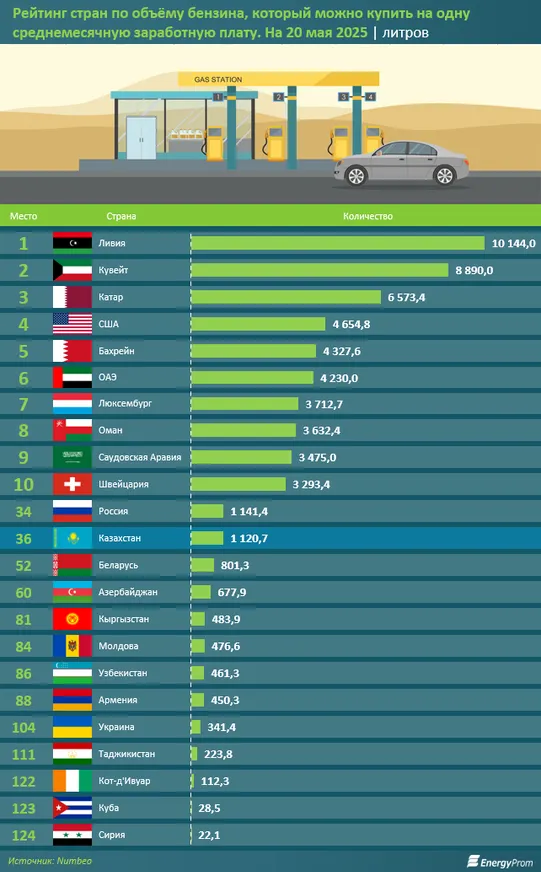 В рейтинге стран по объёму бензина, который можно приобрести на среднюю заработную плату, по состоянию на 20 мая текущего года Казахстан занял 36-е место из 124. В РК на одну среднемесячную зарплату можно было купить 1,1 тыс. литров бензина.