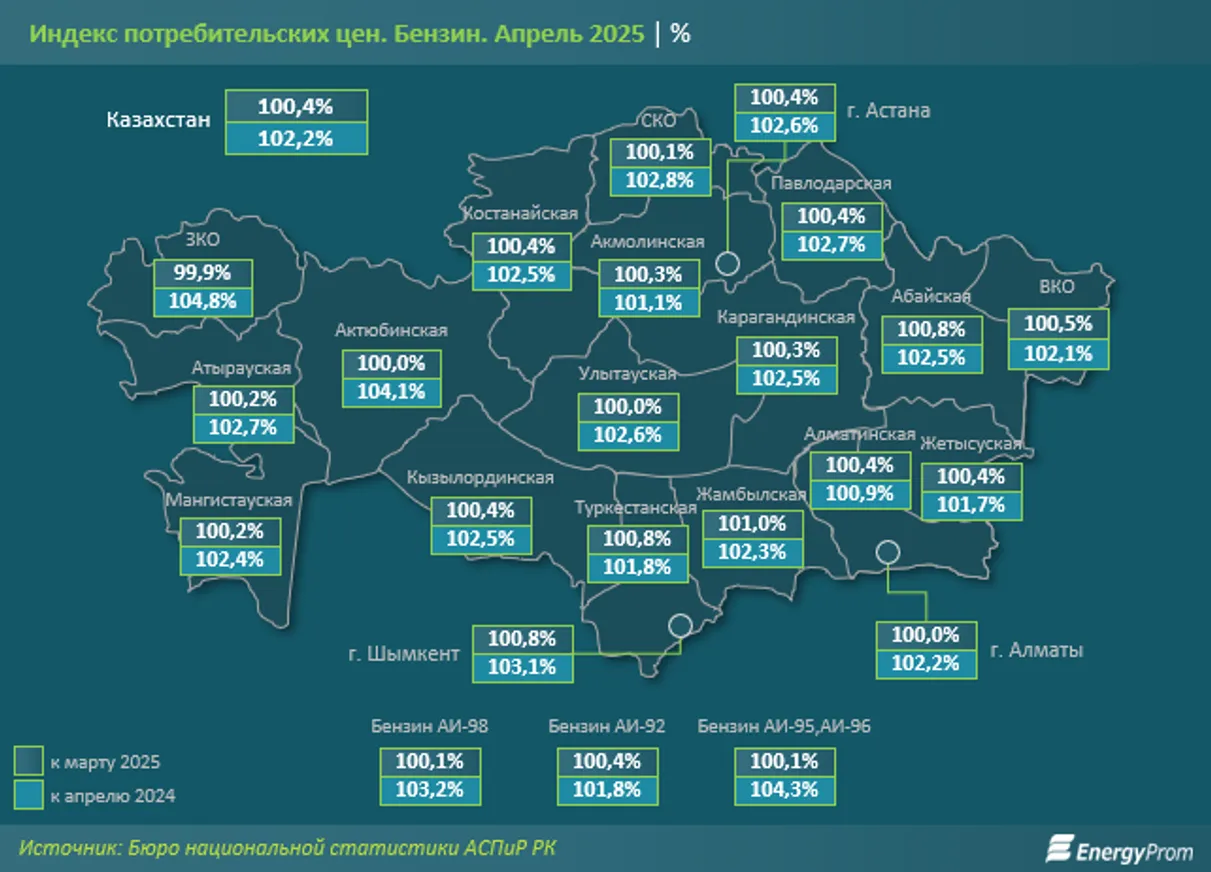 Средняя розничная цена литра бензина марки АИ-92 в апреле составила 205 тенге, АИ-95/96 — 264 тенге, АИ-98 — 299 тенге. Самым дорогим АИ-92 был в Петропавловске (209 тенге за литр), самым дешёвым — в Атырау (195 тенге). Бензин марок АИ-95/96 дороже всего стоил в Талдыкоргане (274 тенге за литр), дешевле всего — в Атырау (243 тенге). Цена АИ-98 самой высокой была в Алматы (315 тенге за литр), самой низкой — в Актобе (283 тенге).