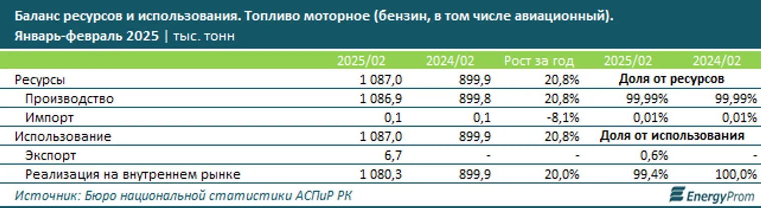 Заметим: за январь-февраль текущего года казахстанские компании обеспечили внутренний спрос на бензин почти полностью: на 99,99%. За два месяца в стране было произведено 1,1 млн тонн бензина — на 20,8% больше по сравнению с аналогичным периодом 2024-го.
