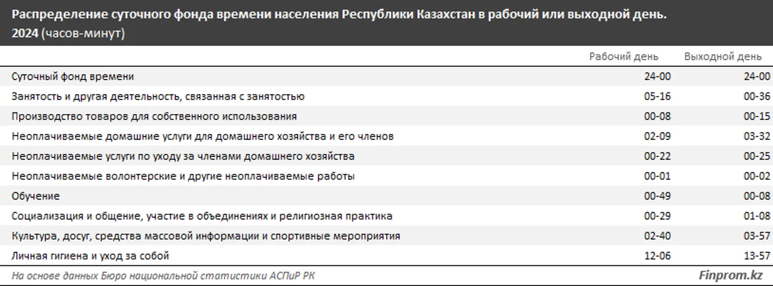 А чем по статистике заняты казахстанцы в течение дня? Согласно официальным данным, в 2024 году больше всего времени у казахстанцев занимали личные дела (формально это называется «личная гигиена и уход за собой»). В том числе во время рабочей недели в день на это уходит 12 часов 6 минут, в выходные — 13 часов 57 минут. Спят казахстанцы в пределах рекомендуемой нормы: в будни — 8 часов 48 минут, в выходные — 10 часов 4 минуты. На приём пищи и питьё тратится 1 час 49 минут в рабочий день и 2 часа 5 минут в выходной. Непосредственно на личную гигиену и уход приходится 1 час 21 минута в будни и 1 час 33 минуты в выходные.