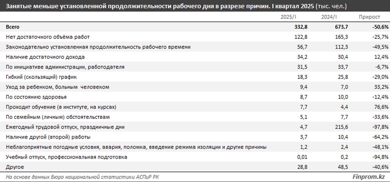 Чаще всего причиной неполной занятости является недостаточный объём работы — в связи с этим меньше нормы трудились 122,8 тыс. человек, тогда как годом ранее таких было 165,3 тыс. Среди других распространенных причин — законодательно установленная сокращенная продолжительность рабочего времени (56,7 тыс. человек), наличие достаточного дохода (34,2 тыс.), решение работодателя или администрации (31,5 тыс.) и гибкий график (18,3 тыс. человек).