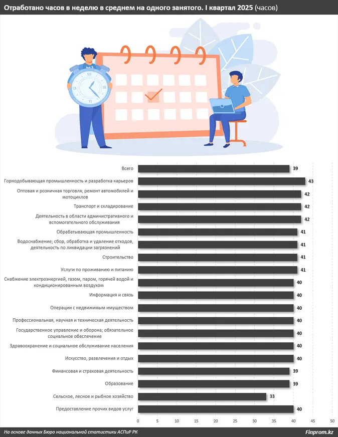 При этом в среднем меньше установленной нормы работают занятые в сельском, лесном и рыбном хозяйстве — 33 часа в неделю. В сфере образования, а также в финансовом и страховом секторах в среднем на одного занятого приходится 39 часов в неделю.