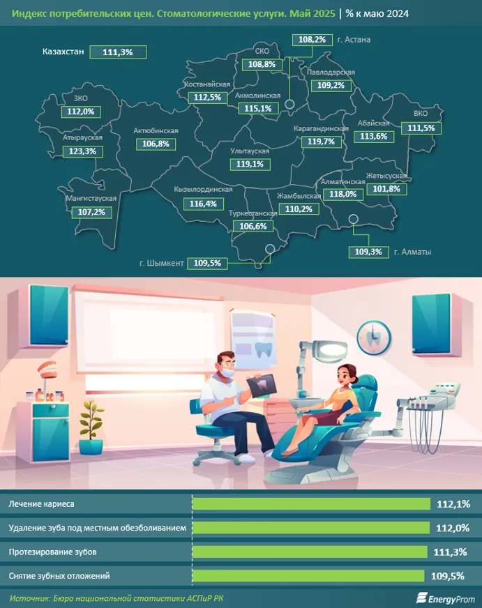 В региональном разрезе наибольший рост цен на стоматологические услуги зафиксирован в Атырауской (плюс 23,3%), Карагандинской (плюс 19,7%) и Улытауской (плюс 19,1%) областях. Наименьший рост наблюдался в Жетысуской (плюс 1,8%), Туркестанской (плюс 6,6%) и Актюбинской (плюс 6,8%) областях.