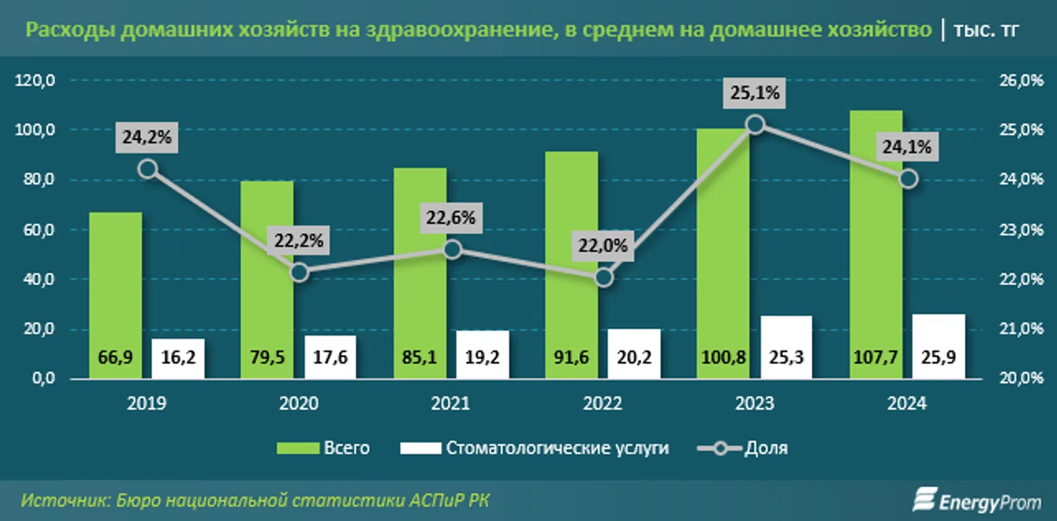 В целом в 2024 году расходы казахстанских семей на стоматологические услуги составили 25,9 тыс. тенге в расчете на одно домохозяйство — на 2,4% больше, чем в предыдущем году. Доля этих расходов в структуре общих затрат на здравоохранение составила значительные для семейного бюджета 24,1%.
