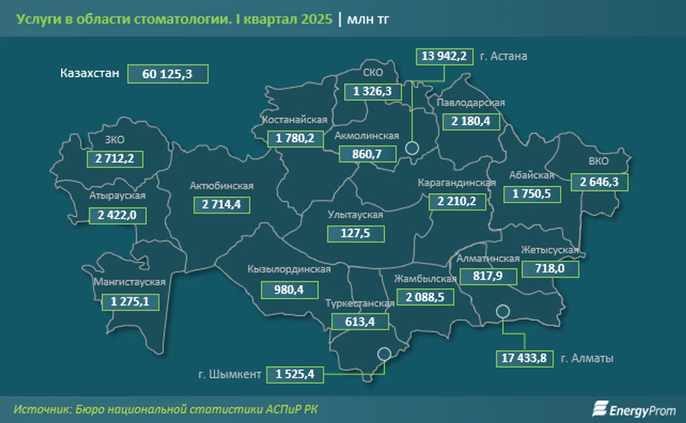 В региональном разрезе больше всего стоматологических услуг было оказано в Алматы — 17,4 млрд тенге, что на 83,8% больше, чем годом ранее. Далее следуют Астана (13,9 млрд тенге), Актюбинская (2,7 млрд тенге), Западно-Казахстанская (2,7 млрд тенге) и Восточно-Казахстанская (2,6 млрд тенге) области.