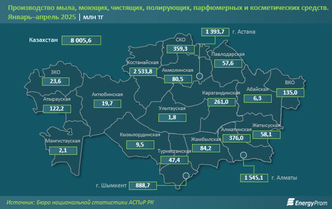 За январь–апрель текущего года в стране произвели мыло, моющие, чистящие, полирующие, парфюмерные и косметические средства на сумму 8 млрд тенге — на 4,3% больше в деньгах, чем годом ранее, пишет Energyprom.kz.