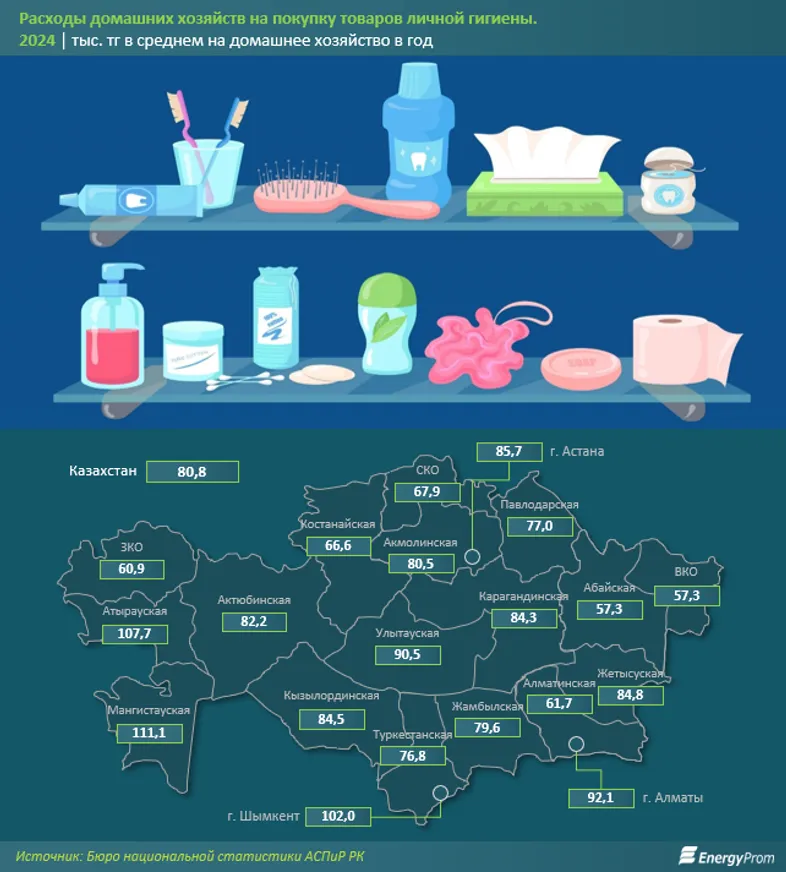 Меньше всего тратят на товары личной гигиены жители Восточно-Казахстанской области — 57,3 тыс. тенге в среднем на семью, на 3% больше, чем годом ранее и на 29,1% меньше, чем среднестатистическая казахстанская семья. Также немного тратят на товары гигиены жители Абайской (57,3 тыс. тенге) и Западно-Казахстанской (60,9 тыс. тенге) областей.