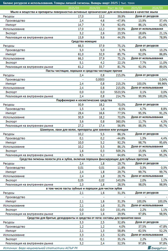 Несмотря на рост производства в секторе бытовой химии и косметических товаров, обеспеченность остается весьма низкой — страна практически полностью зависит от импорта. К примеру, по рынку чистящих паст, средств и порошков страна на 100% зависит от ввоза: в текущем году не было произведено ни одной единицы продукции. При этом годом ранее хоть и в небольшом объеме, но выпуск все же осуществлялся.