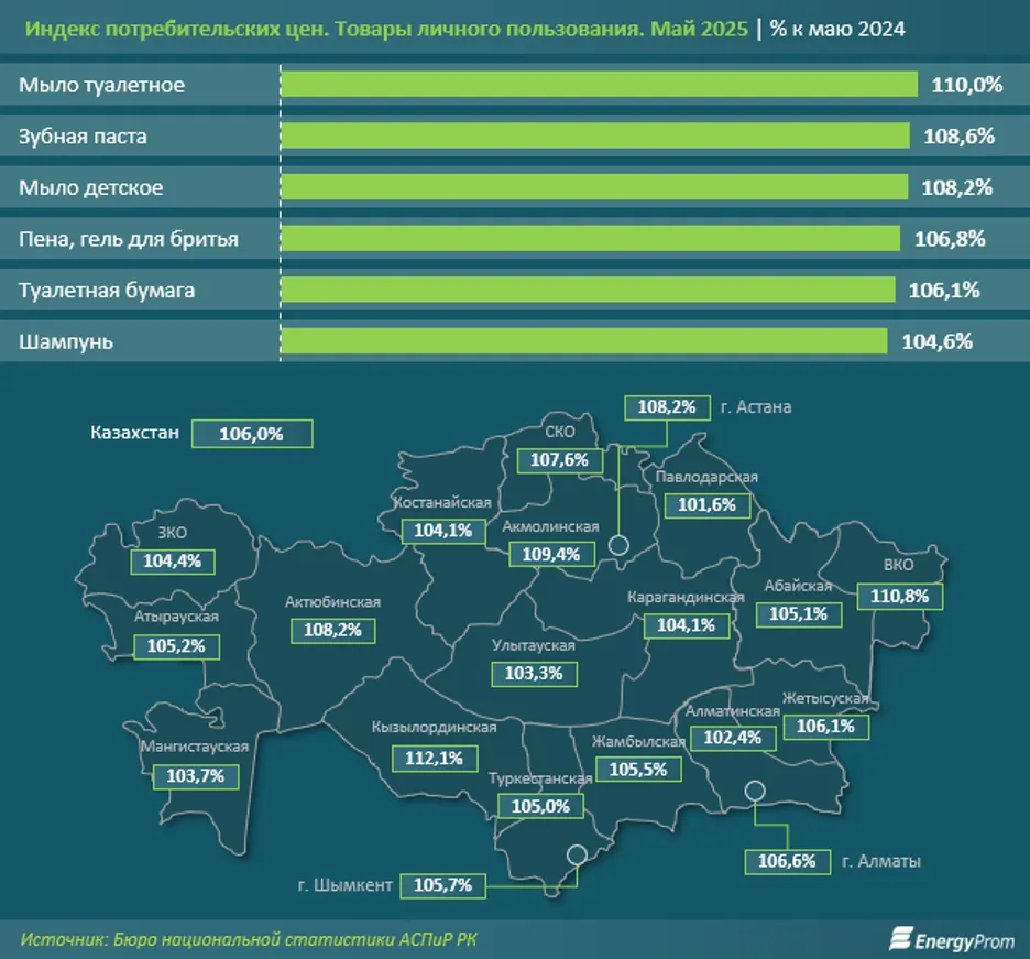 В региональном разрезе наибольший годовой рост цен отмечен в Кызылординской (на 12,1%), Восточно-Казахстанской (на 10,8%) и Акмолинской (на 9,4%) областях. Наименьший рост фиксировался в Павлодарской (на 1,6%), Алматинской (на 2,4%) и Улытауской (на 3,3%) областях.