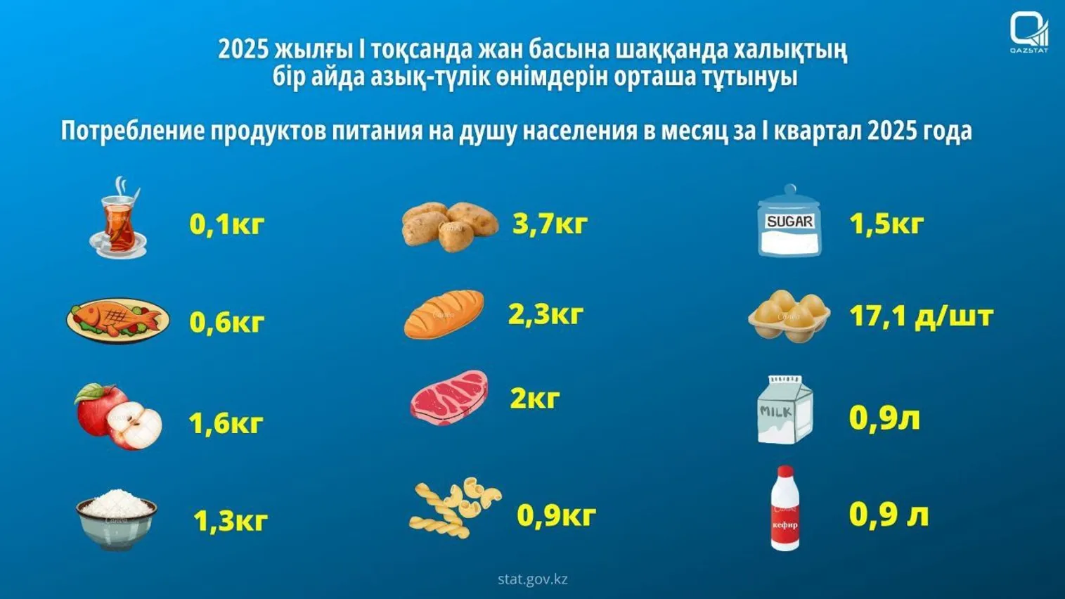 Бюро национальной статистики (БНС) опубликовало информацию по потреблению продуктов питания за I квартал 2025 года, передает корреспондент центра деловой информации Kapital.kz. Данные получены по результатам выборочного обследования среди 12 тыс. домашних хозяйств по уровню жизни, уточняют в БНС.