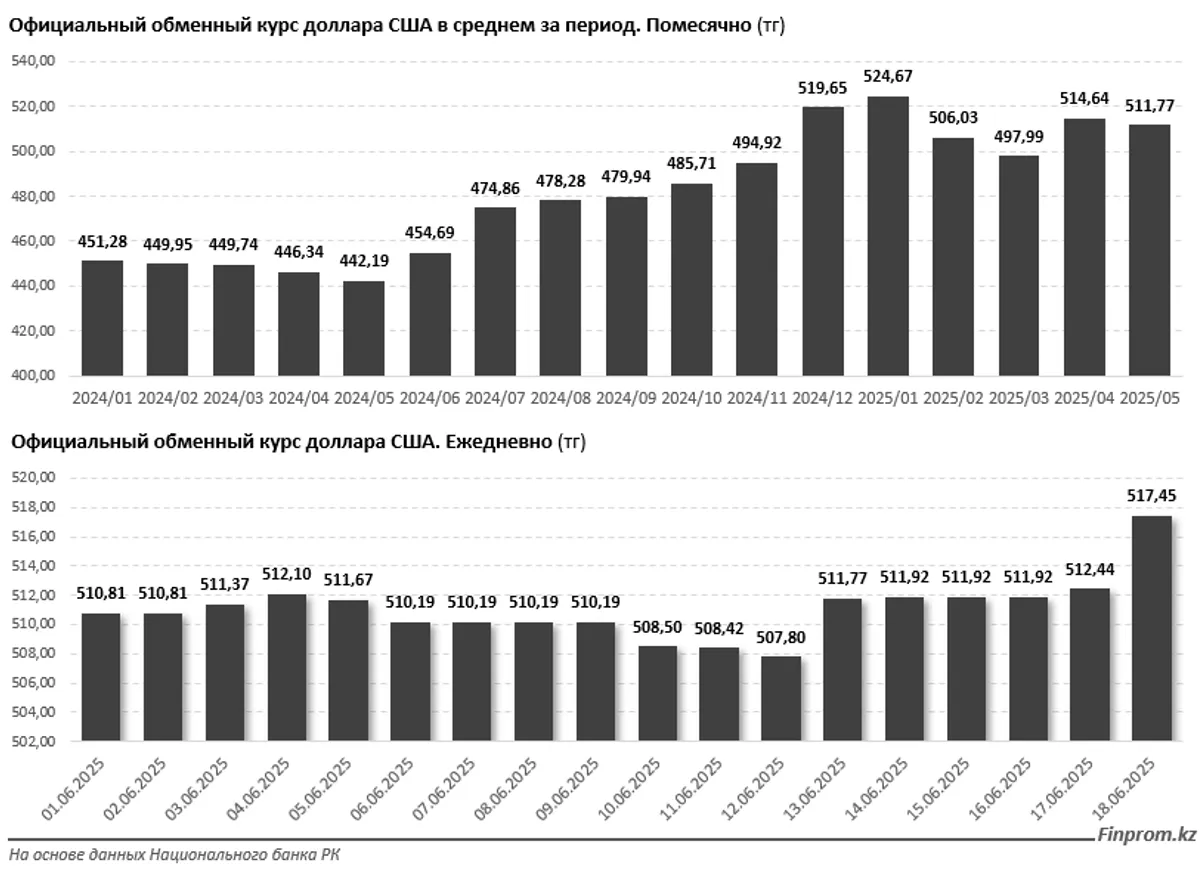 В мае 2025 года среднемесячный официальный курс доллара составлял 511,8 тенге, что на 0,6% ниже, чем в апреле текущего года. В целом с начала 2025 года доллар подешевел на 2,5%, что могло бы указывать на относительную стабилизацию тенге. Однако в годовом выражении ситуация иная: по сравнению с маем 2024 года доллар вырос на 15,7%.