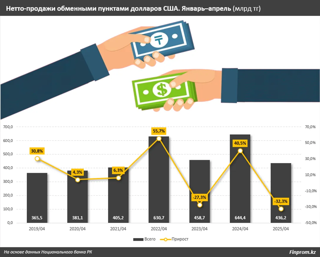 Объем нетто-продаж долларов через обменные пункты за январь-апрель 2025 года составил 436,2 млрд в тенговом эквиваленте – это самый низкий показатель за аналогичный период с 2021 года. Об этом сообщает центр деловой информации Kapital.kz со ссылкой на Finprom.kz.