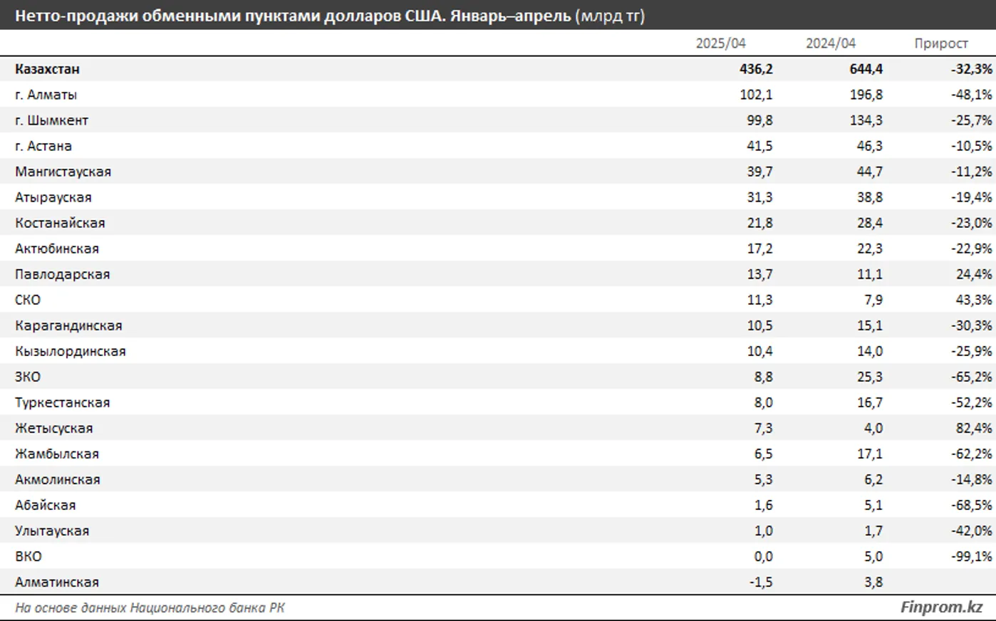 Стоит отметить, что лишь в трех из 20 регионов РК объем нетто-продаж обменными пунктами долларов вырос по сравнению с прошлым годом: в Жетысуской (на 82,4%), Северо-Казахстанской (на 43,3%) и Павлодарской (на 24,4%) областях.