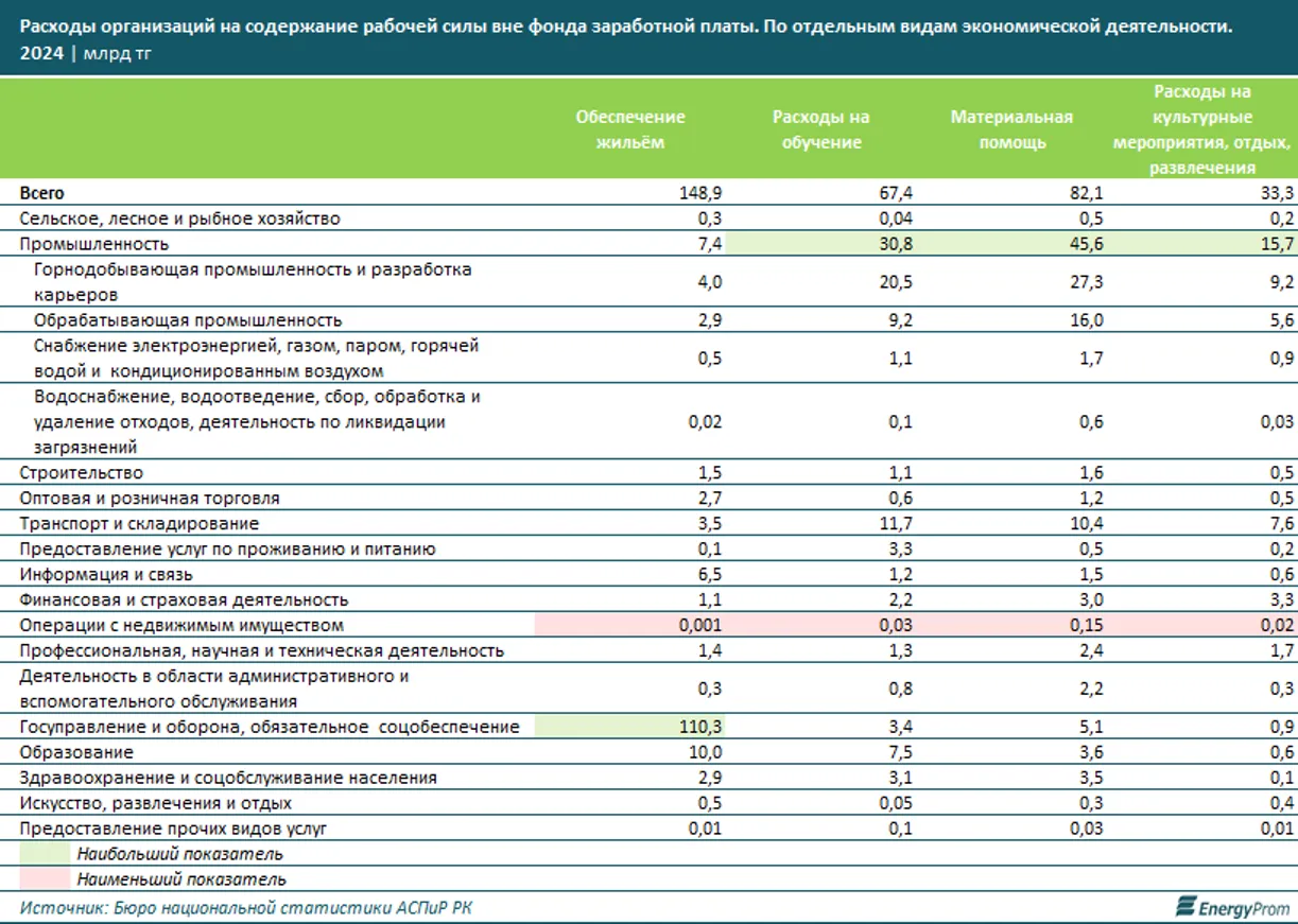 Например, на проведение различных культурно-массовых мероприятий и отдых сотрудников в прошлом году казахстанские компании выделили 33,3 млрд тенге (минус 19,9% к 2023 году). На обучение работников было выделено в два раза меньше денег — всего 67,4 млрд тенге против 133,9 млрд тенге годом ранее. В июне портал Finprom.kz опубликовал материал о снижении расходов работодателей на обучение казахстанцев в вузах и колледжах.