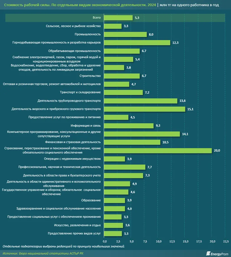 Самый высокий СРС — 20 млн тенге — в прошлом году был в сфере страхования и пенсионного обеспечения. В этой категории работодатели не очень много денег тратили на обучение и развлечения сотрудников, нет данных о компенсации этим работникам расходов на жильё. 90% стоимости рабочей силы в секторе — это зарплата. И она у них действительно значительно больше, чем в целом по экономике. По данным БНС, в прошлом году средняя номинальная зарплата в сфере страхования, перестрахования и пенсионного обеспечения составляла 1,6 млн тенге, при средней по экономике в 405,4 тыс. тенге. При такой зарплате вряд ли сотрудники жалуются на отсутствие тимбилдинга.