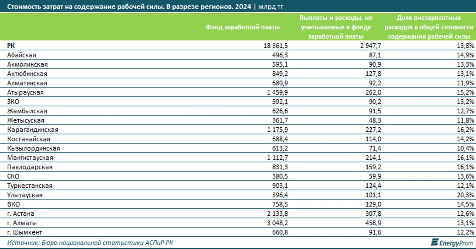 Ранжирование регионов по внезарплатным расходам работодателей можно провести по доле таких затрат от СРС. В среднем по РК она составляет 13,8% и может ощутимо отличаться в разных частях страны. Например, в Кызылординской области организации тратили всего 10,4% всех расходов на персонал именно на внезарплатные статьи. В то же время в Улытауской области организации на зарплату выделяли 79,7% от СРС, а на всё остальное — аж 20,3%. Доля внезарплатных расходов в регионах-лидерах — в пределах 13–16%.