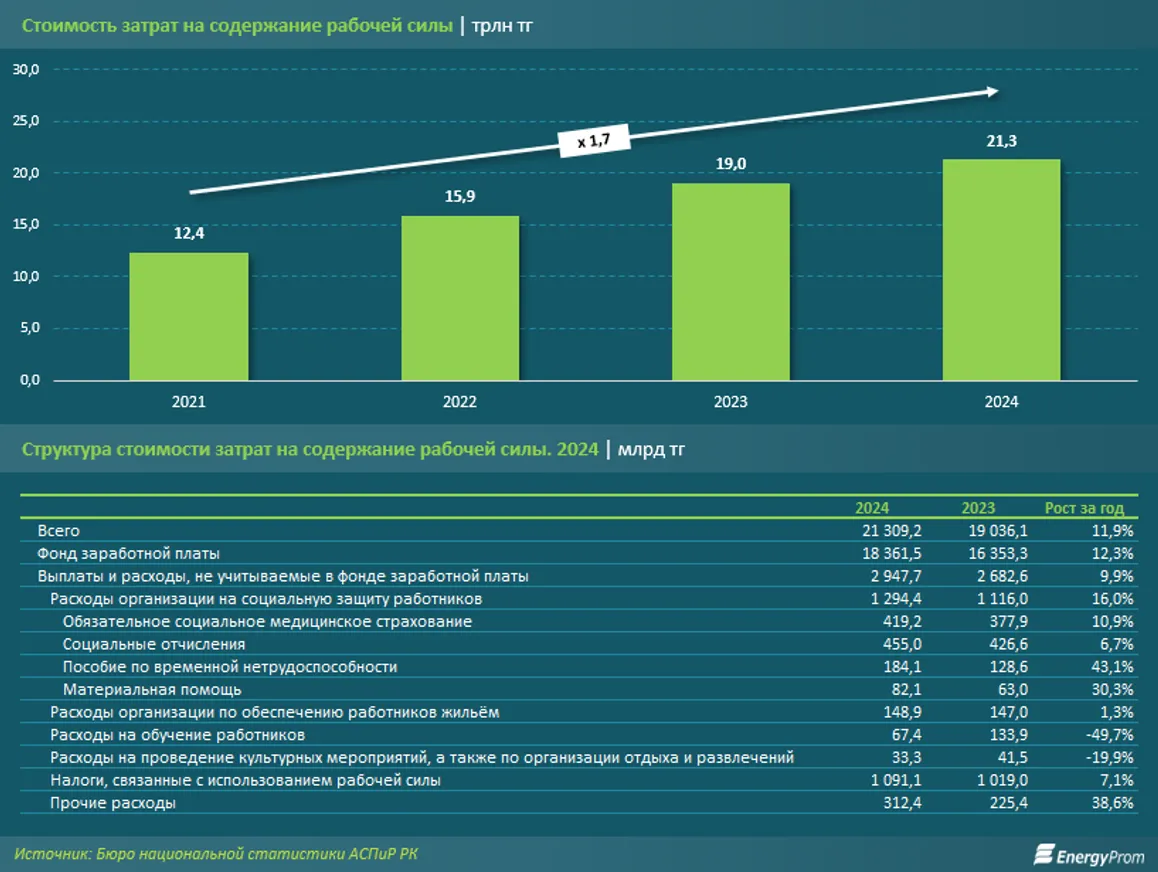 Основная статья затрат на персонал — это, безусловно, оплата труда. Фонд заработной платы занимает в общих расходах 86,2%. В абсолютных значениях в 2024 году сумма, выплаченная персоналу за работу, составила 18,4 трлн тенге. За год этот важнейший показатель состояния рынка труда увеличился на 12,3%, что превышает официальный уровень инфляции (8,6%).