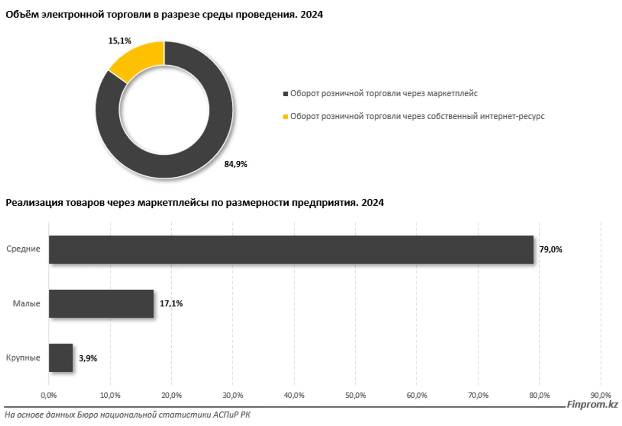 Заметим: 96,1% от общего объёма розничной электронной торговли через маркетплейсы приходится на малые и средние предприятия (МСБ). Если рассматривать детальнее, то 79% — это средние предприятия, 17,1% — это малые, 3,9% — крупные компании. Таким образом, именно маркетплейсы стали драйвером развития сетевой торговли для МСБ в Казахстане.