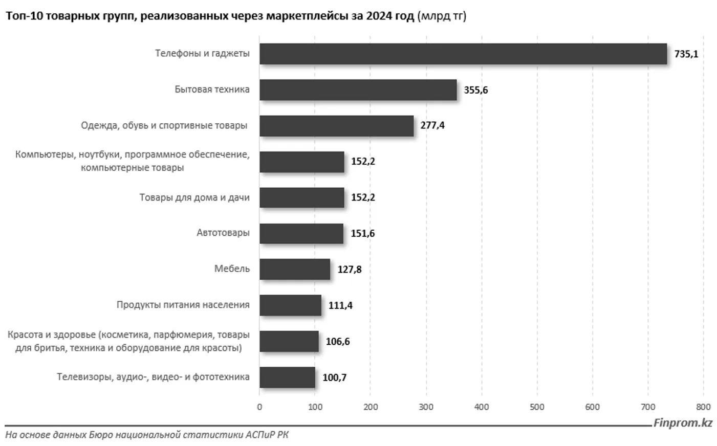 Кроме того, в топ вошли: компьютеры, ноутбуки, программное обеспечение, компьютерные товары (152,2 млрд тенге), товары для дома и дачи (152,2 млрд тенге), автотовары (151,6 млрд тенге), мебель (127,8 млрд тенге), а также продукты питания (111,4 млрд тенге).