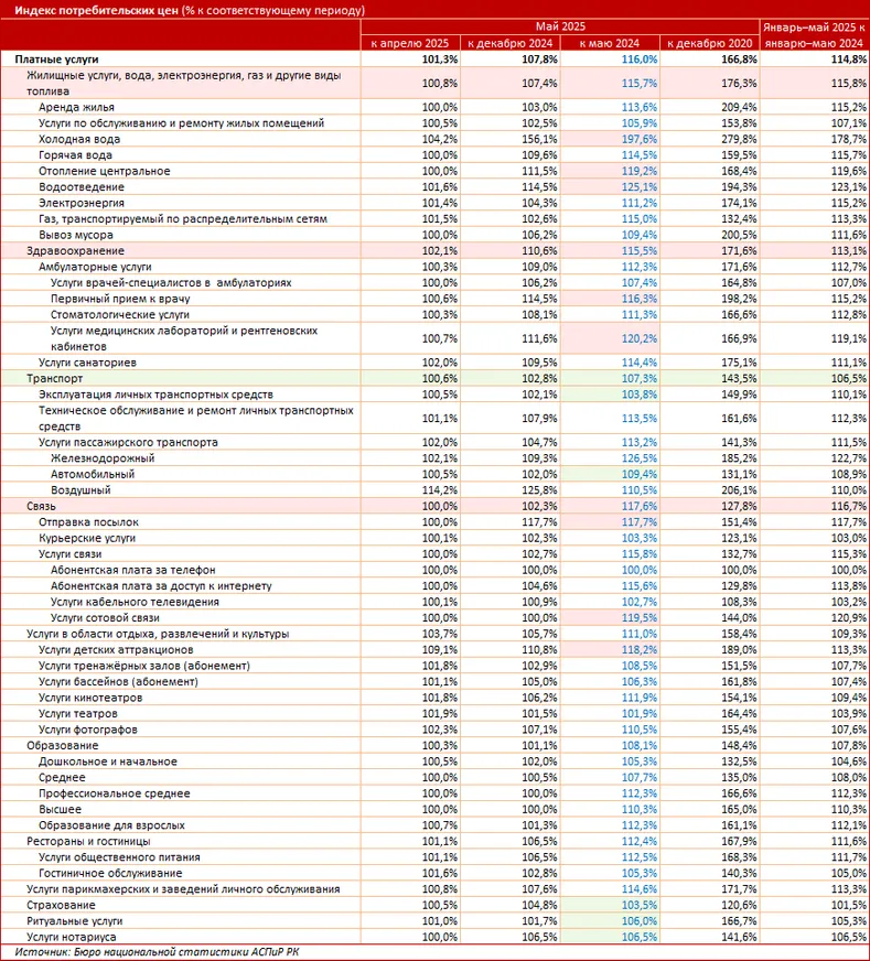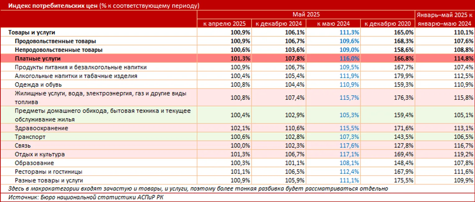 Инфляция в Казахстане ускоряется. В мае 2025 года годовой рост цен составил 11,3% (в апреле — 10,7%). Цены на платные услуги за год выросли на 16% (в апреле — на 15,7%), на продовольственные товары — на 9,6% (в апреле — на 8,5%), на непродовольственные товары — на 9% (в апреле — на 8,9%), сообщает ranking.kz.