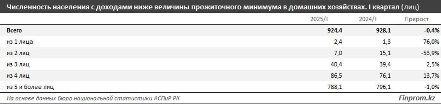Примечательный факт: наибольшая численность граждан с доходами ниже прожиточного минимума проживает в семьях из пяти и более человек — 788,1 тыс. человек, практически столько же, сколько и годом ранее (снижение всего на 1%). Кроме того, 86,5 тыс. человек проживают в семьях из четырёх человек, 40,4 тыс. — из трёх человек, 7 тыс. — из двух, и 2,4 тыс. человек — в семьях из одного человека.