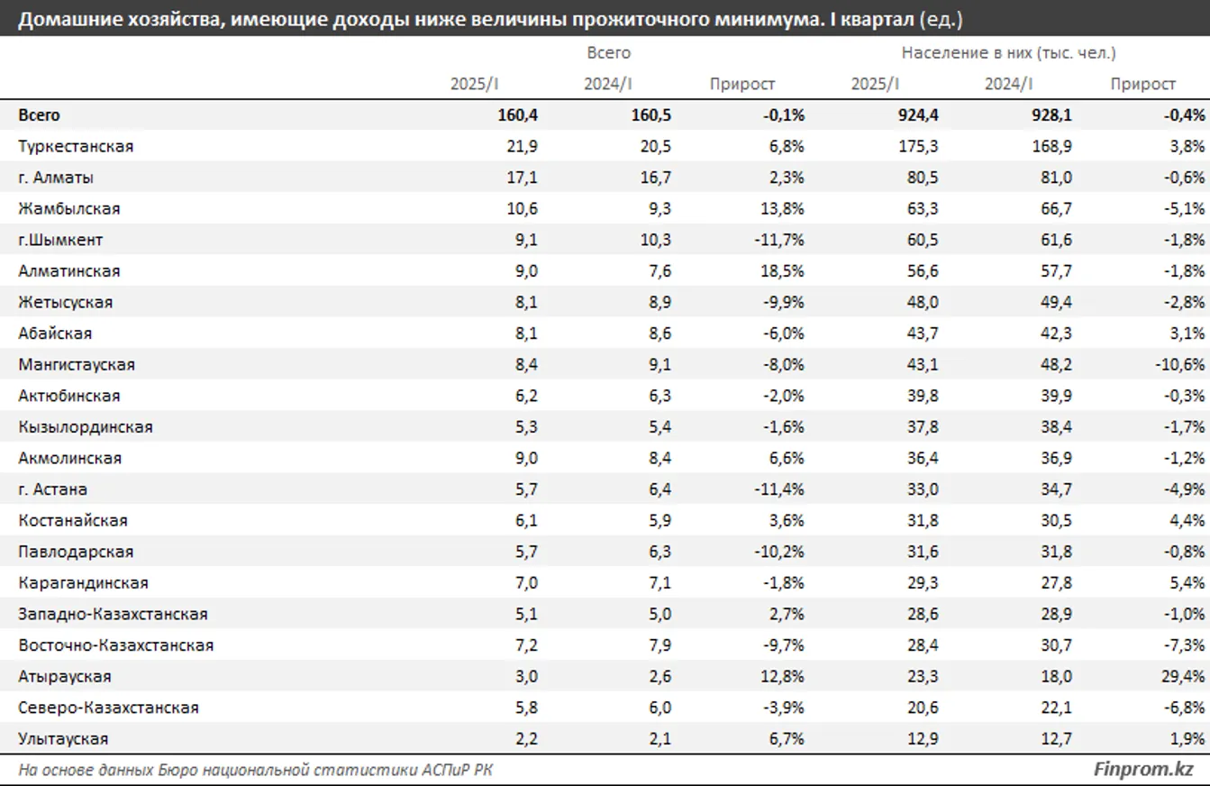 В региональном разрезе больше всего семей с доходами ниже прожиточного минимума проживают в Туркестанской области — 21,9 тыс., что на 6,8% больше, чем в первом квартале прошлого года. На втором и третьем местах расположились Алматы (17,1 тыс. семей) и Жамбылская область (10,6 тыс. семей). Меньше всего таких семей проживает в Улытауской, Атырауской и Западно-Казахстанской областях — 2,2 тыс., 3 тыс. и 5,1 тыс. соответственно.
