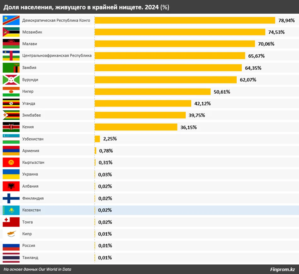 По данным Our World in Data, Казахстан, по крайней мере исходя из официальной статистики, относится к странам с минимальной долей населения, проживающего в крайней нищете* — всего 0,02%. Свою позицию наша страна разделила с Албанией, Финляндией и Тонга.