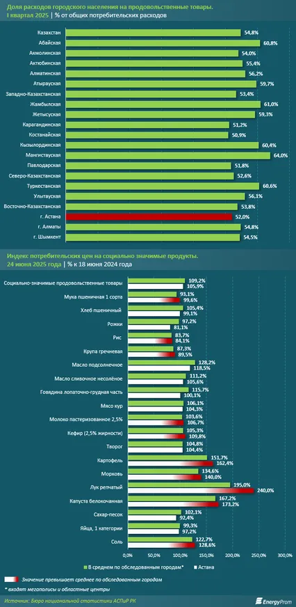 Вместе с тем можно отметить, что цены на продукты в Астане не самые низкие. Согласно опубликованным данным БНС на 24 июня, из 19 видов социально значимых продовольственных товаров 14 в столице стоят дороже, чем в среднем в крупных городах РК. Среди них — мясо кур, молочные продукты, овощи, подсолнечное масло.