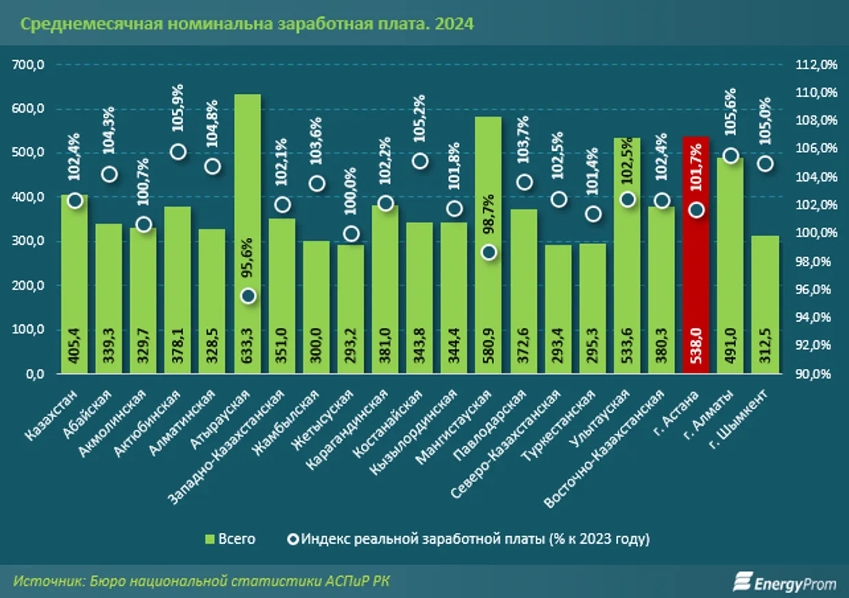 Что касается зарплат, за которыми едут в столицу внутренние мигранты, то они в Астане действительно выше средних по стране — 538 тыс. тенге. Это данные за первый квартал текущего года. В таких регионах, как Атырауская и Мангистауская области, зарабатывают больше: 633,3 тыс. и 580,9 тыс. тенге соответственно. Это обусловлено структурой экономики нефтедобывающих регионов. В Астане же основу экономики составляют услуги (79,7% от ВРП).