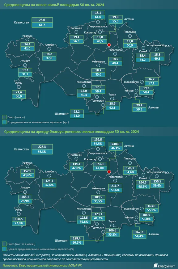 Что касается аренды, то снимать жилье в Астане тоже намного дороже, чем в других мегаполисах или областных центрах. Согласно данным БНС, средние цены на съем благоустроенной квартиры площадью 50 квадратных метров в прошлом году в Астане приблизились к 248 тыс. тенге. Показатель аренды более 200 тыс. тенге был применим в прошлом году только к трем городам: кроме столицы, в их число вошли Алматы и Караганда. Из-за дороговизны аренды жителям крупных городов приходится удерживать намного больше из зарплаты на оплату проживания. Например, в Астане этот показатель составляет 46,1% от средней месячной зарплаты, в Алматы — 54,4%, в Шымкенте — 60,3%.